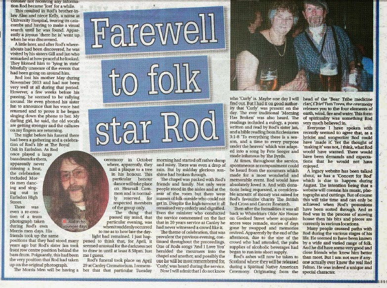 A legacy website has been talked about, as has a ‘Concert for Rod’ which is due to happen during August. e intention being that a website will contain his music, photographs and cuttings. But of course this will take time and can only be achieved when Rod’s possesions have been sorted through. And as Rod was in the process of moving house then his bits and pieces are currently in various locations.