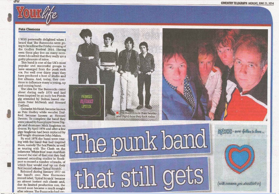 Pete Clemons with his latest article for the Coventry Telegraph. They recently played the Godiva Festival and back in the 70’s they played Mr Georges with Neil O’Connor’s punk band – The Flys who continued to tour with them after that. I saw the Buzzcocks gig at Tiffany’s with Penetration c 1978.