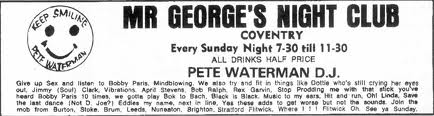 But there is no doubt that as far back as 1969 Pete Waterman performed at venues such as The Baginton Oak and The Mercers Arms. He would sometimes work under the alias of Dandelion and would also double up with another DJ known as Chantilly Tilly.