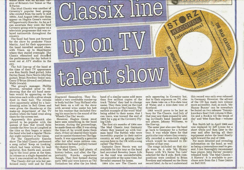 The Mad Classix was another of Coventry’s popular beat groups who existed from the early to mid 1960s. And August 1964 saw them appear on Hughie Green’s version of Opportunity Knocks. As far as I can ascertain they were the first Coventry group ever to appear on a television programme that was relayed nationwide throughout the country.