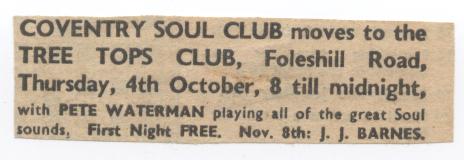 Pete’s DJing is legendary and there are various Coventry Telegraph articles on this blog by Pete Clemons which looks at some of the venues that Pete Waterman DJ’d at – The Locarno (Tiffany’s) / Tree Tops / The Walsgrave / The Mercer’s Arms – check them out in the index.