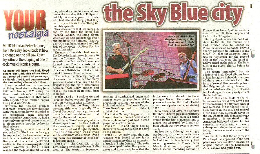 AS many will know the Pink Floyd album ‘The Dark Side of the Moon’ was released almost 40 years ago, on March 1, 1973, and became one of the best selling albums of all time.