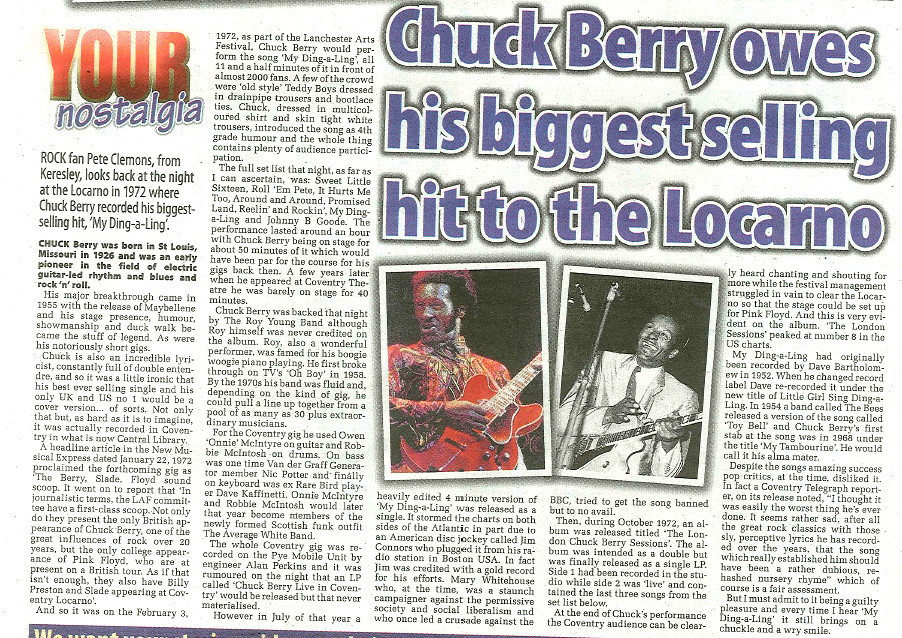 Chuck Berry owes his biggest selling hit to the Locarno; YOUR nostalgia ROCK fan Pete Clemons, from Keresley, looks back at the night at the Locarno in 1972 where Chuck Berry recorded his biggestselling hit, ‘My Ding-a-Ling’.