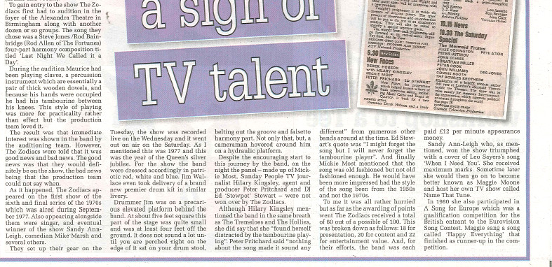 The group’s manager, Phillip Newton, revealed prior to the showing that the six band members would be appearing on the television each with a silver streak dyed in their hair. The streaks were apparently added by a hairdressing salon in Bell Green and were given the thumbs-up at the make-up department of the TV studios when the band went along there for the screen test.