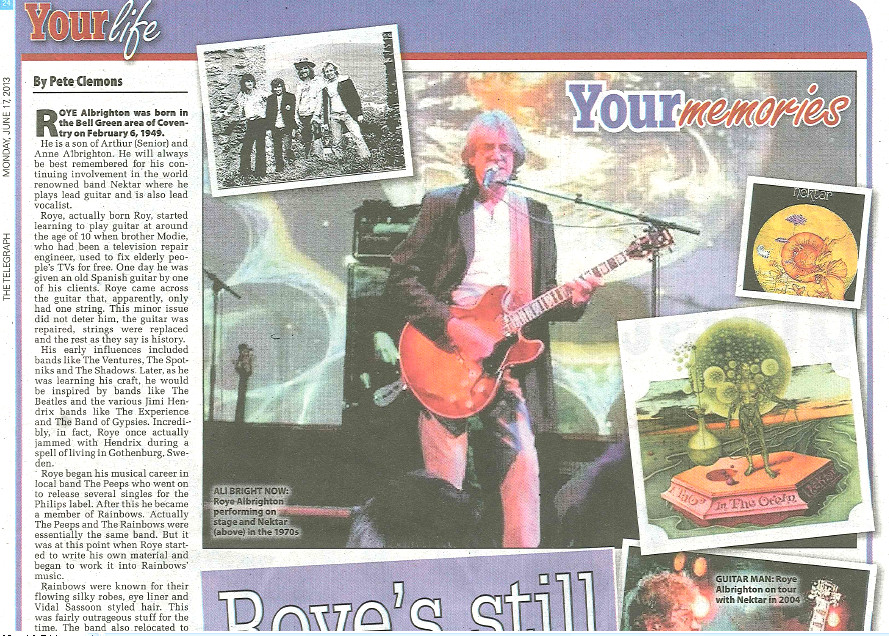 ROYE Albrighton was born in the Bell Green area of Coventry on February 6, 1949. He is a son of Arthur (Senior) and Anne Albrighton. He will always be best remembered for his continuing involvement in the world renowned band Nektar where he plays lead guitar and is also lead vocalist.