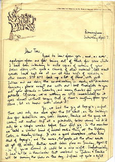 Well, sadly we missed your Scene (the Humpoesic Happening) last Wedsnesday. I’d passed the message around but most of us were away….still we attempted to get a motor together so at least a few performers, musicians, poets might make the trip over. As it happened that failed too and eventually Roland and Sue from Bishopton Rd. decided to go by train and thereby represent the people after all. Yet fate struck once more that evening. No sooner had they arrived at New Street, guitar and all, then it became clear that they weren’t going to make Coventry before 10pm. So they turned round and came home. It is a shame we couldn’t join you this time – we shall though, when it happens again. ..as an epilogue to all this – we hope very much that a fine time was had by all. Another step towards togetherness.