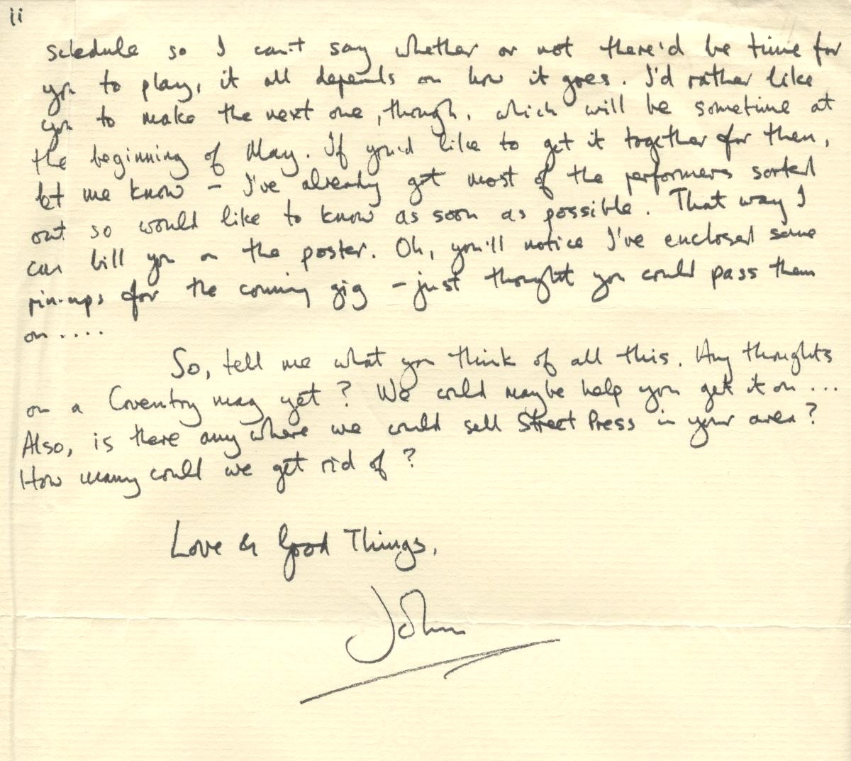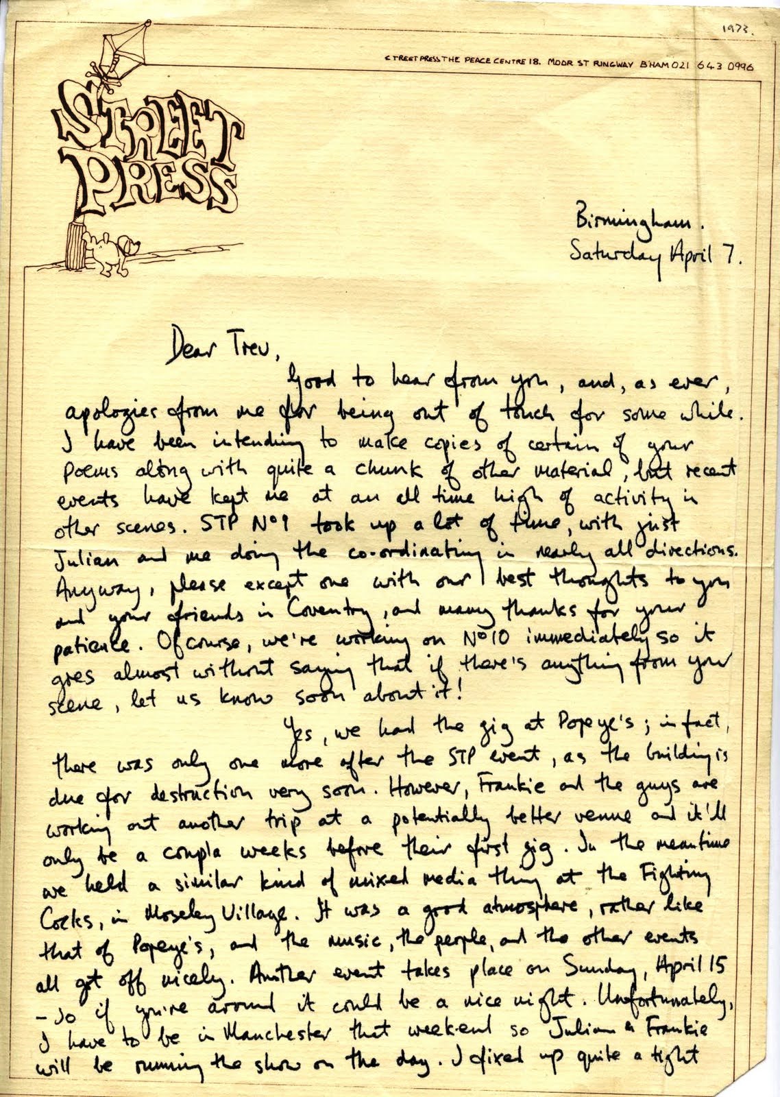 We’re grateful to you for doing quite a job in spreading the Streetpress word. We’ve gotta pull in more material from the surrounding localities …particularly Coventry. Please keep on talking and doing what you can to help us, provided you still want to and have the energy to spare!!” John Keetley. (from all your brothers an sisters here)