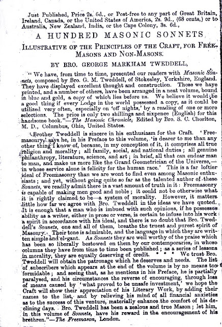 Brother Tweddell is sincere in his enthusiasm for the Craft. “Freemasonry” says he in his preface ” is dearer to me than any other thing I know of, because, in my conception of it, it comprises all true religion and morality ; all family, social and national duties; all genuine philanthropy, literature, science, and art ; in brief, all that can endear man to man, and make us more like the Grand Geometrician of the Universe, in whose service alone is felicity for the human race.” This is a far loftier ideal of freemasonry than we are wont to find even among Masonic enthusiasts; and yet, without going as far as the talented author of these sonnets, we readily admit that there is a vast amount of truth in it; Freemasonry is capable of making men good and noble; it could not be otherwise what it is claimed to be  – a system of morality