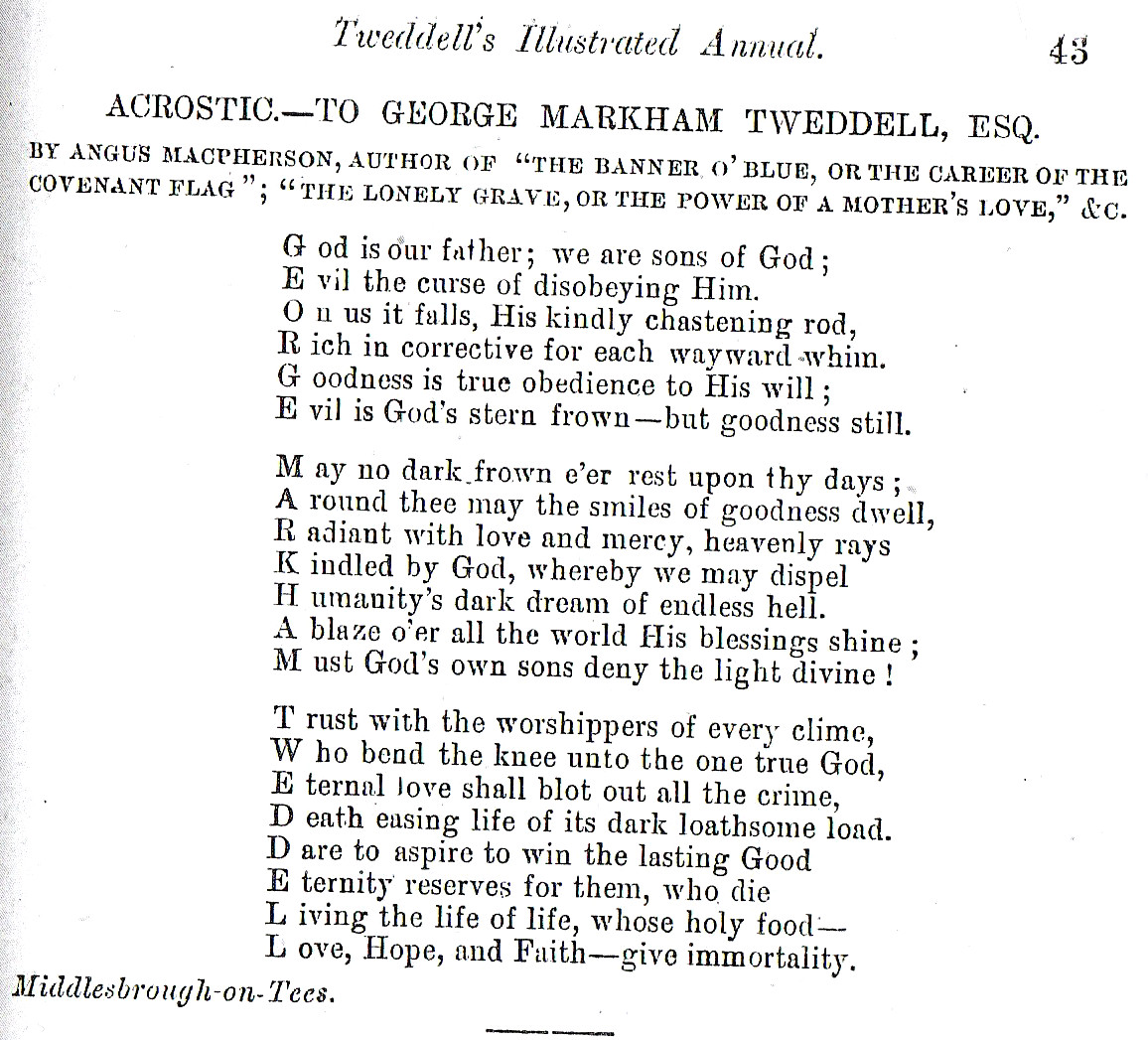 George Markham Tweddell had been collecting materials for his People’s History of Cleveland ever since he worked as an apprentice printer for William Braithwaite in Stokesley in the early 1840’s and became friends with John Walker Ord whose History and Antiquities of Cleveland he helped to print. Only four issues of the People’s History of Cleveland appeared in his latter years with much material remaining unpublished but a lot of the material was used along the way to inform his many other publications.