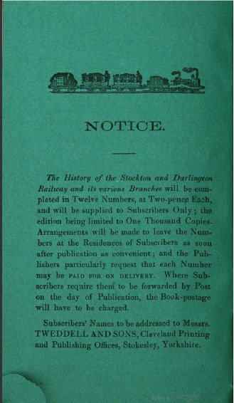 Middlesbrough at the commencement of this century, were to give place to a more numerous population of industrious human beings, and, on what were then rabbit-warrens and fox-covers and gravel-pits, long lines of streets were to be built, and manufactures and commerce connect its denizens with all the world. The first passenger railway had been opened from Darlington to Stockton, September 27th, 1825; but, though coals had been brought down from the pits to the Tees by steam power, Stockton showed no signs of ever becoming a port for their exportation, and the far-sighted Peases soon perceived that it could be much better done six miles nearer to the sea where the river was deeper, and there was more elbow-room. Notwithstanding the vigorous opposition of the principal inhabitants of Stockton, the Act for a branch railway to Middlesbrough received the royal assent May 23rd, 1828; the Act for another railway, from Haverton Hill, on the opposite side of the Tees, to Sim Pasture, in the parish of Heighington, being passed at the same time; the latter being known as the Clarence Railway. This was only a day short of a year before the Act was passed for a railway from Newcastle-on-Tyne to Carlisle; at that time railways being far from common.