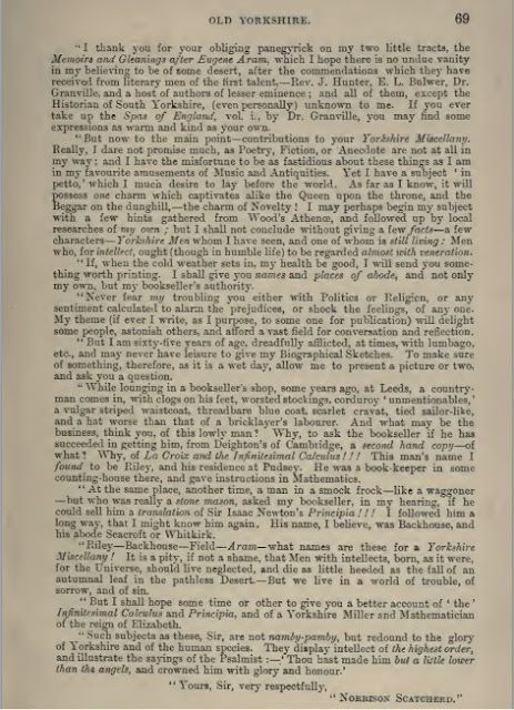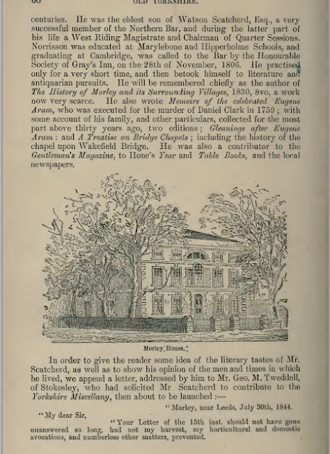 In c 1844 /5 when GM Tweddell was running Tweddell’sYorkshire Miscellany, he received a reply from a potential literary contributor Norrisson Cavendish Scatcherd FSA. This letter was published in the book Old Yorkshire Edited by William Smith F.S.A.S.in 1881