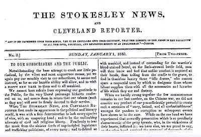 Unfortunately, by the time a third edition of his newspaper was being planned, representatives of the local propertied class visited Braithwaite to persuade him to stop broadcasting George’s criticism of the Tory government, of which they were firm supporters. They demanded Braithwaite withdrew the use of his printing press and the licence to publish from the premises. As a result the printer dismissed George (probably on the legal grounds of “bringing his master into disrepute”). Within a month, remarkably, George had managed to acquire a new license and access to a new press (although from whom is not known) to produce the third edition on time. For George, the contents for the editorial for this edition were obvious and he castigated his former employer, claiming Braithwaite was trying to ‘crush our little periodical’, and that ‘our printer is a good easy man, afraid that our generous principles of peace on earth and goodwill toward men should be mistaken for his own’. ” Paul Tweddell http://www.tweddellhistory.co.uk/chapter3.html“When The Stokesley News, and Cleveland Reporter first made its appearance in the political and literary world, it was with a firm determination to lash every species of vice, with an unsparing hand; and to be the unflinching advocate of civil and religious liberty. Fearlessly to tear the mask from the sinister deeds of unprincipled legislators and trafficking politicians, of every party……”