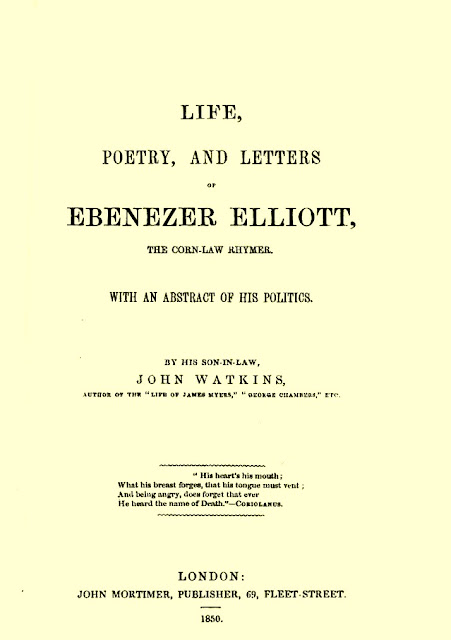 Whitby Playwright, poet, Chartist John Watkins married daughter and wrote a biography of Elliott which is available free on line here http://openlibrary.org/books/OL23312977M/Life_poetry_and_letters_of_Ebenezer_Elliott_the_Corn-law_rhymer)