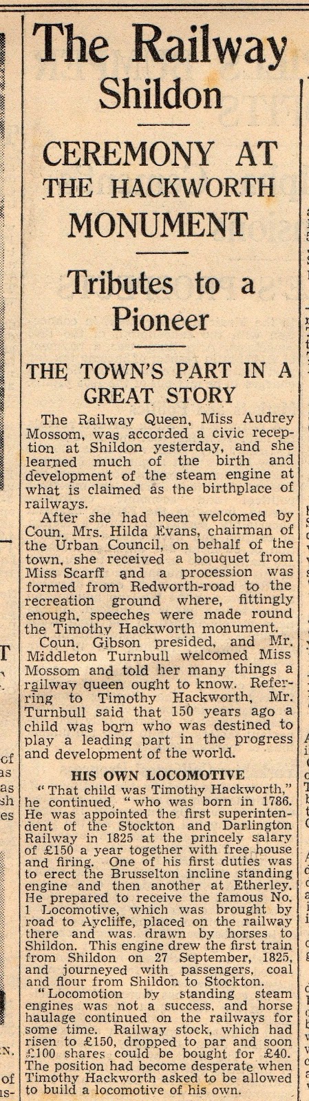 The cutting is undated but i think this is from around 1936 as it says “150 years ago a child was born..” ie Timothy Hackworth – 1786 – 1850.