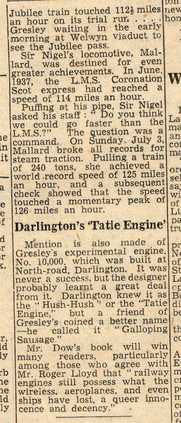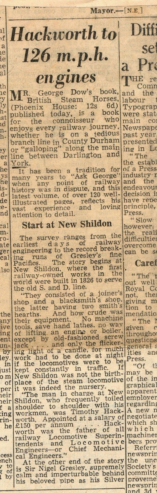 “Hackworth to 126 MPH Engines” Press Cutting Leave a Reply Possibly Northern Echo – 1950 (When the George Dow book British Steam Horses was published. Photo of this book from the internet – and not in Joan’s archive.
