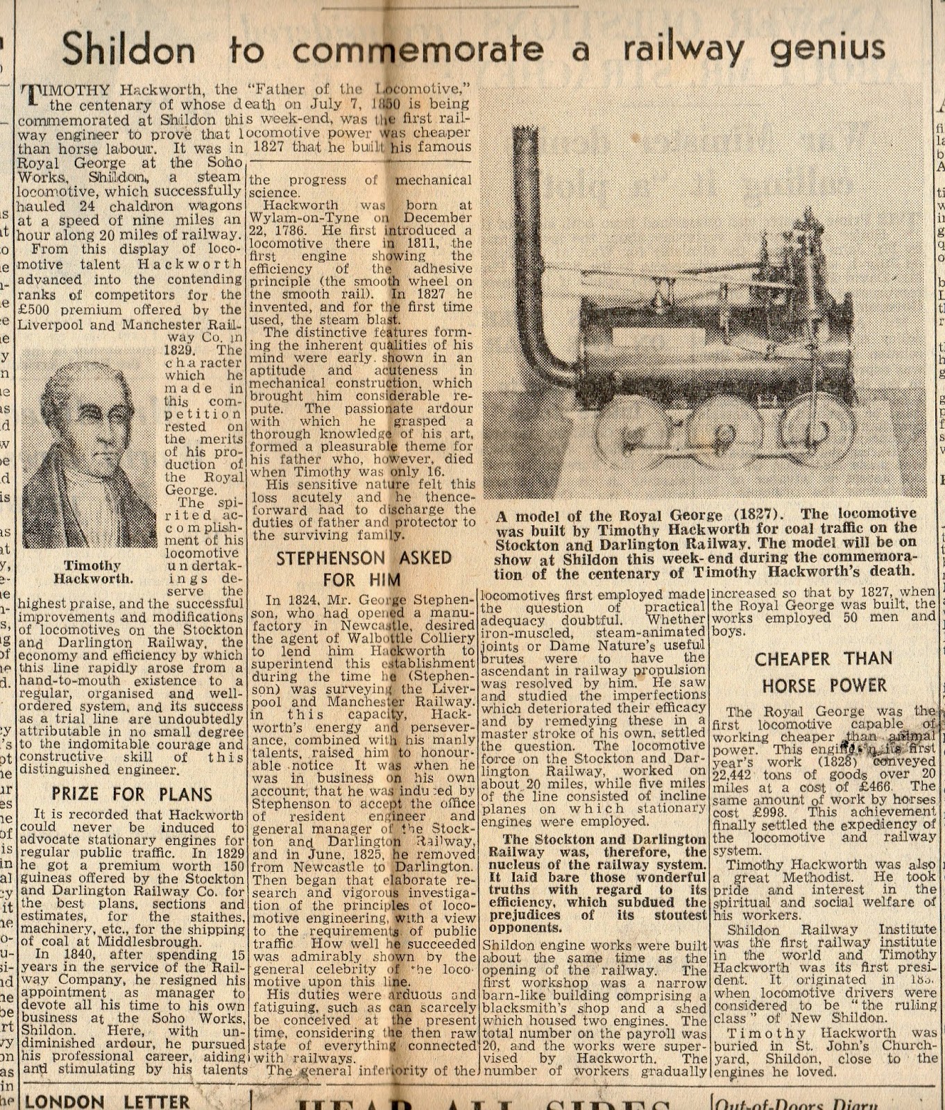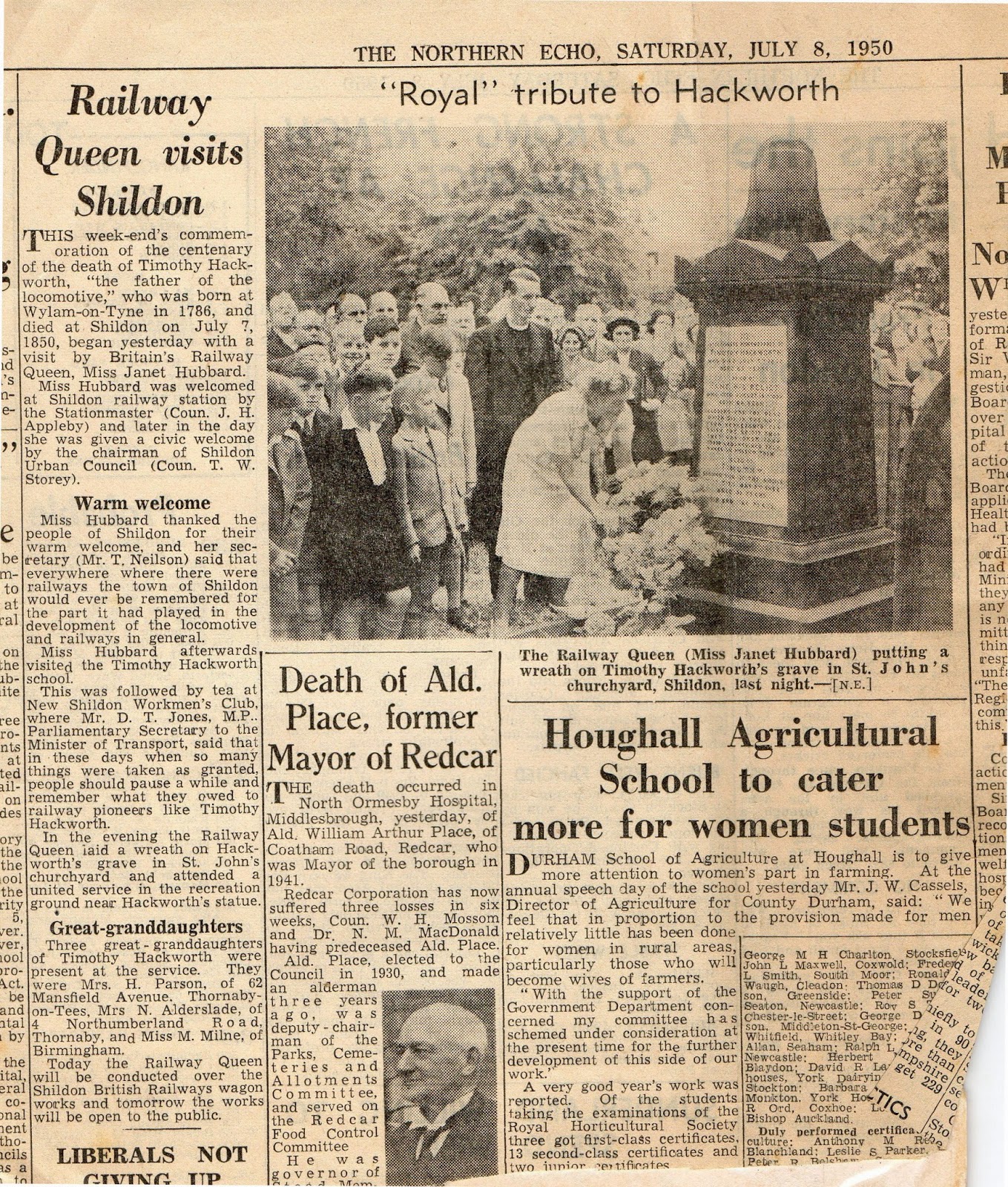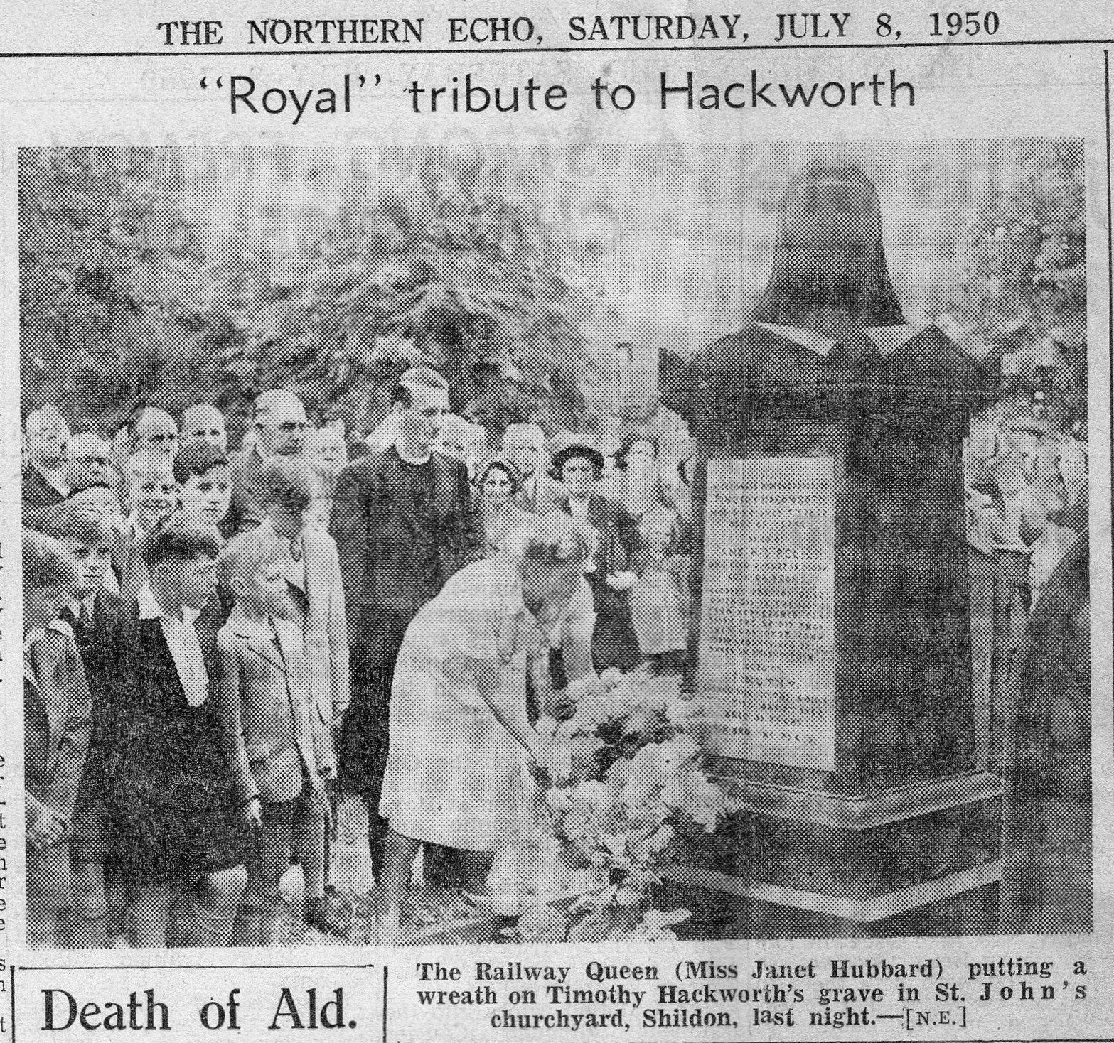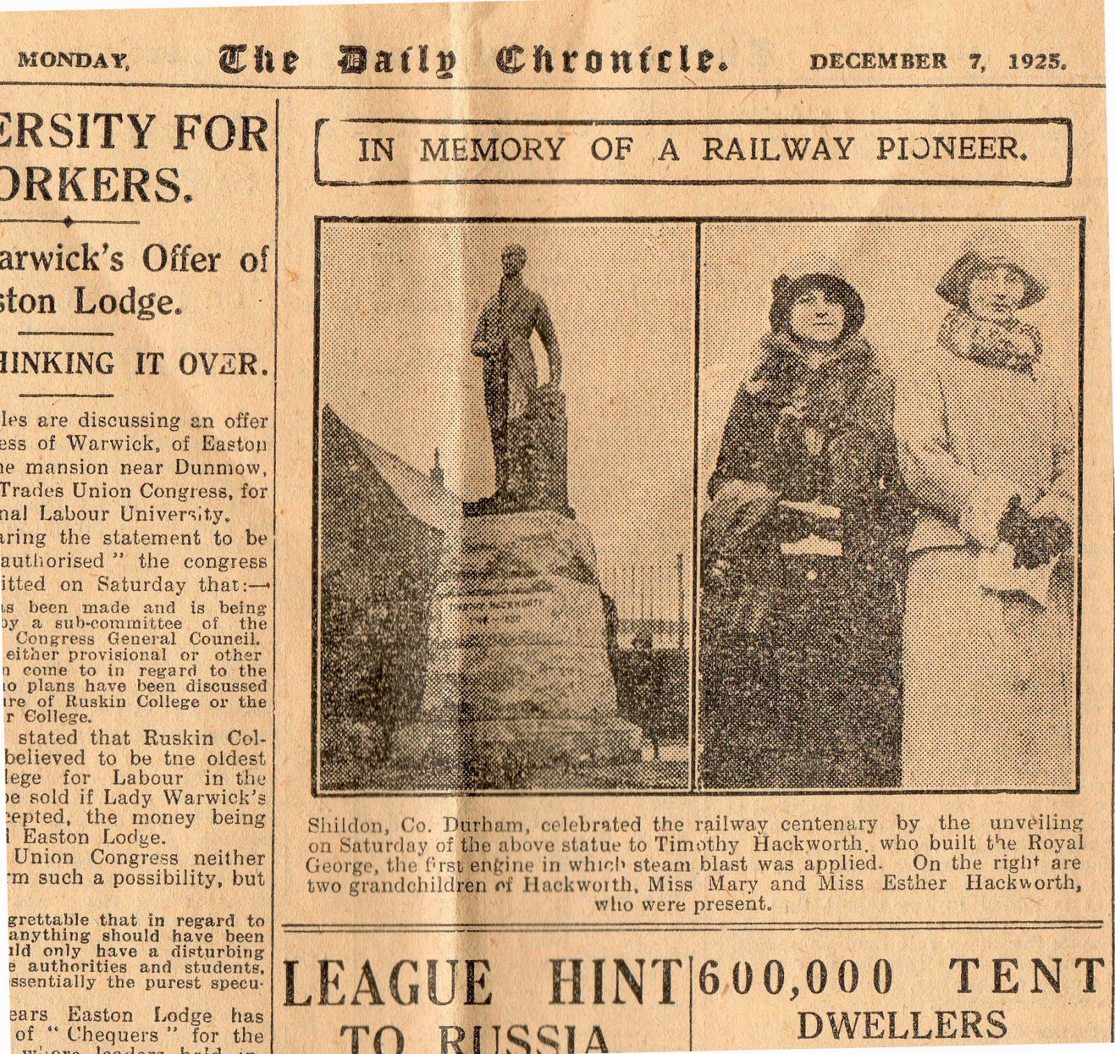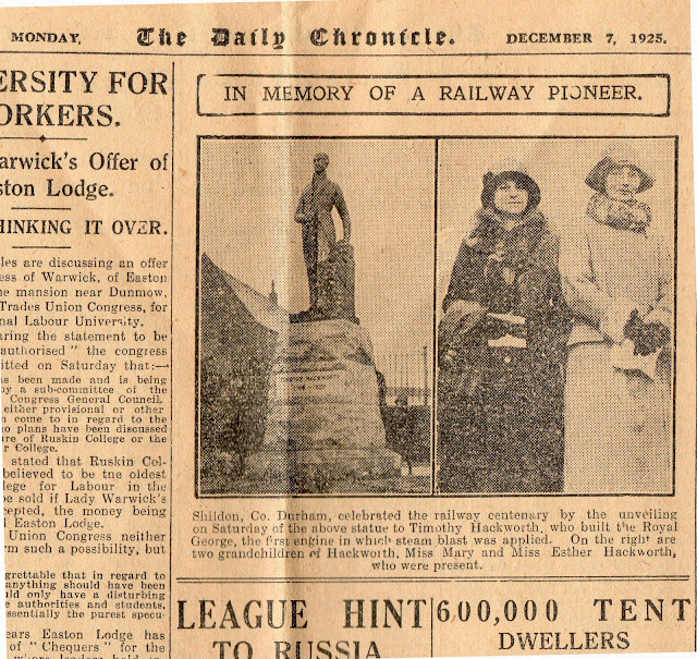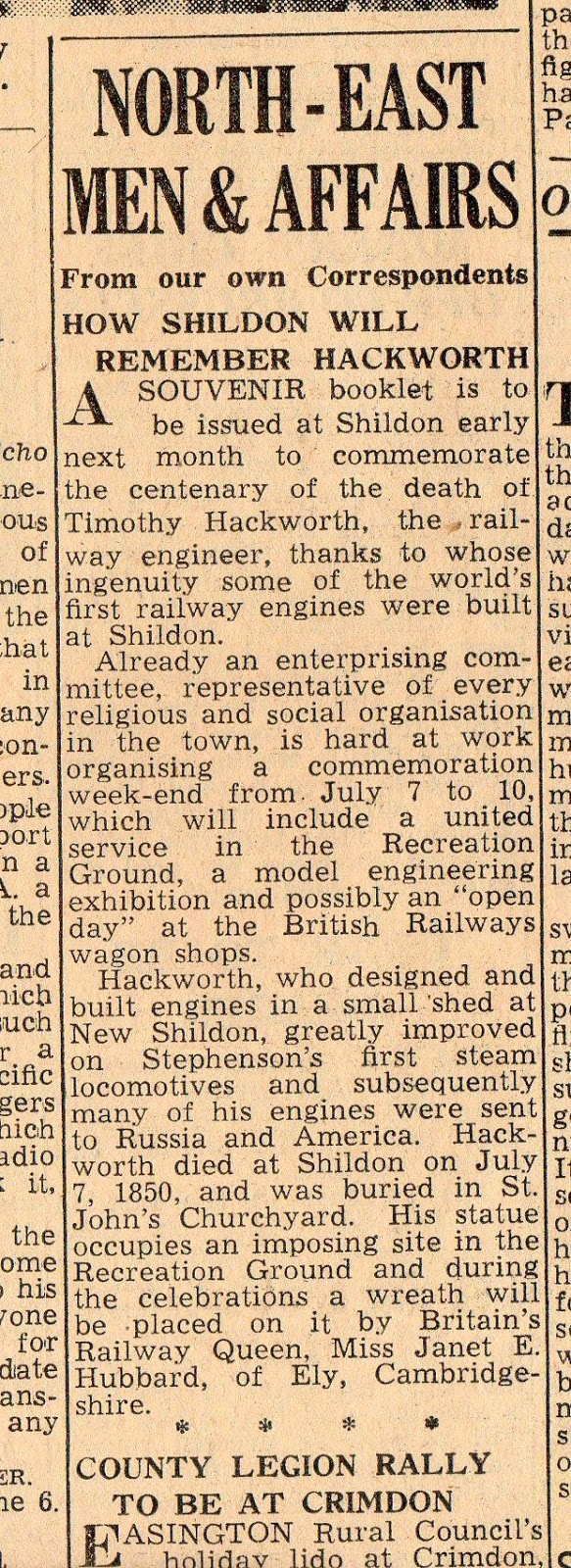 Descendant of Hackworth Thanks Shildon – 1950 (Press Cutting) Leave a Reply Published letter from Winifred Parsons (Hackworth) – Joan’s mother. From Northern Echo 1950.