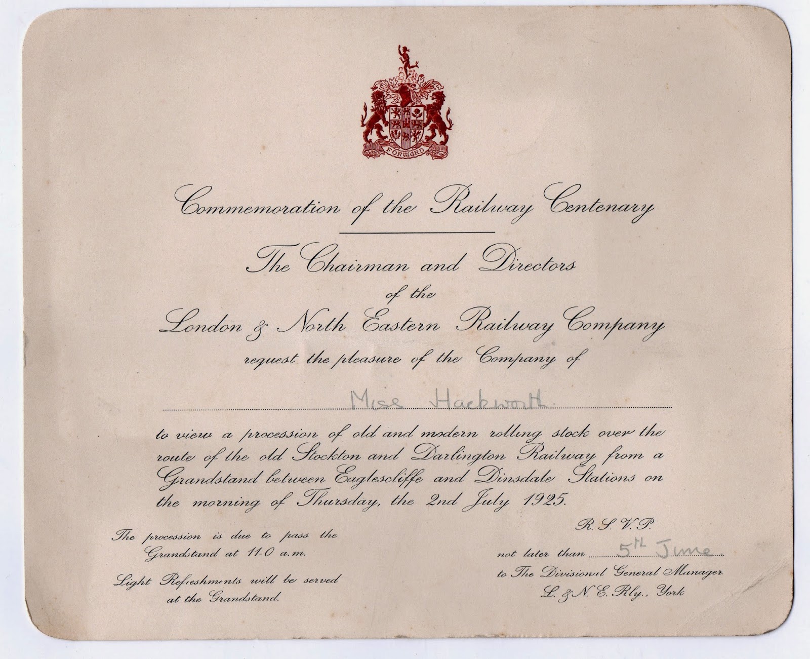 In particular Mrs Winifred Parsons and her daughter Joan Hackworth Parsons (later known as Joan Hackworth Weir). They were living at 62, Mansfield Avenue, Thornaby. Also from Mrs Alderslade of 4, Northumberland Road. The two women were the granddaughters of John Wesley Hackworth, who was the eldest son of Timothy Hackworth. Mrs parsons was the wife of harry parsons, an engineer at head Wrightson.