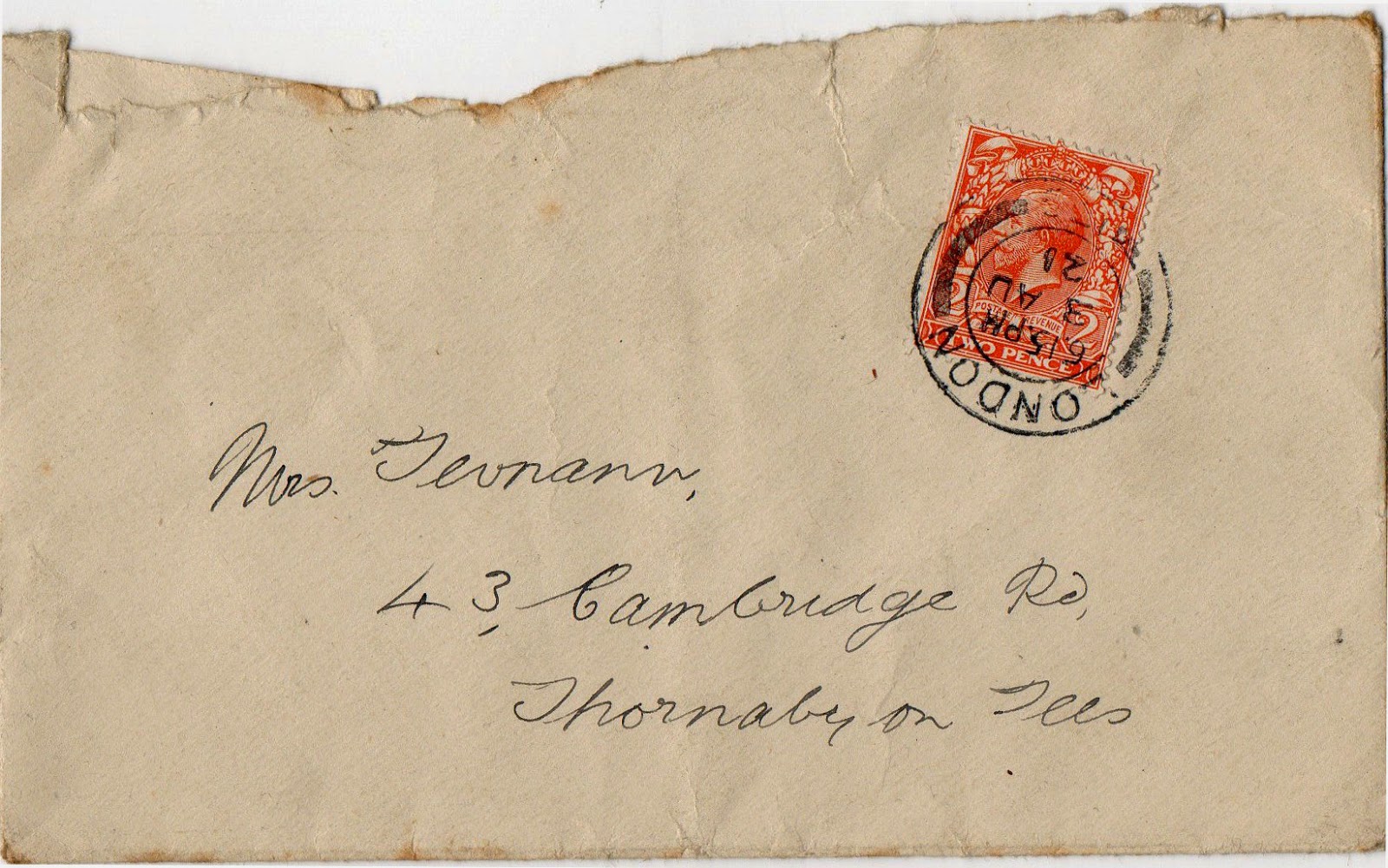 The name of the addressee can be seen on the envelope here and I think the date is 1921, looking at the stamp. The name may be Tivnann, as there is another much later letter from a Tivnann of Thornaby.
