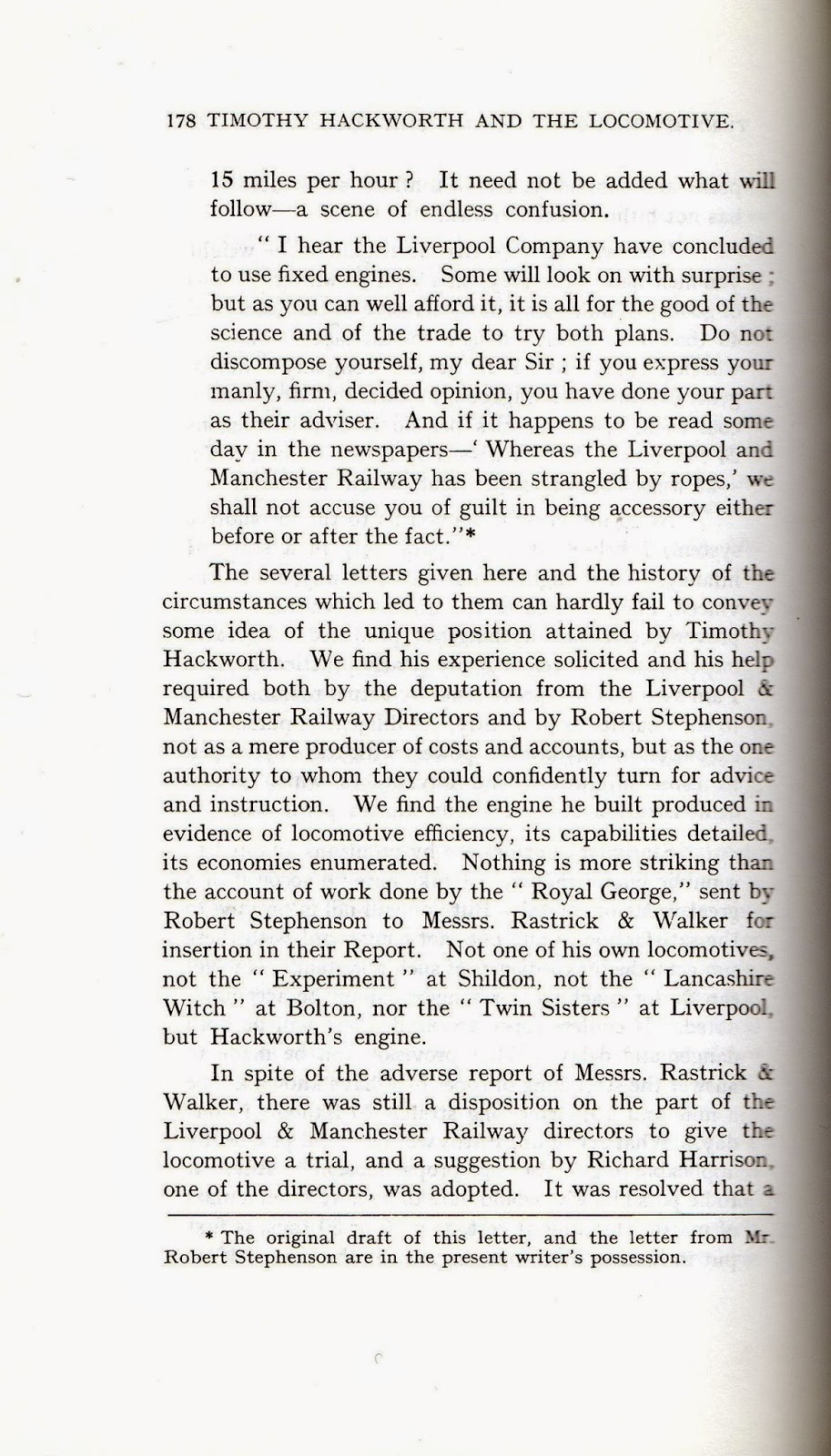 This letter (and other’s contained in Robert Young’s book) “convey  some idea of the unique position held by Timothy Hackworth. We find his experience solicited and his help required both by the deputation from the Liverpool and Manchester Railway Directors and by Robert Stephenson, not as a mere producer of costs and accounts, but as the one authority to whom they could confidently turn for advice and instruction.” Robert Young.
