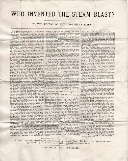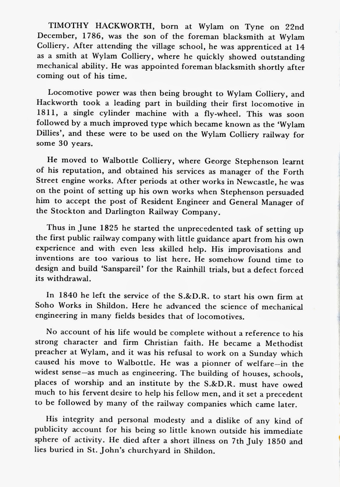 The above link is to the free PDF file of this booklet from 1950. The file is too big to read on this display like the other ones but if you follow the link to Google drive you can download the booklet. It offers a history of Timothy Hackworth for those who attended the 1950 centenary of Timothy’s death in 1850, along with some photos – mostly reproduced also on this display.