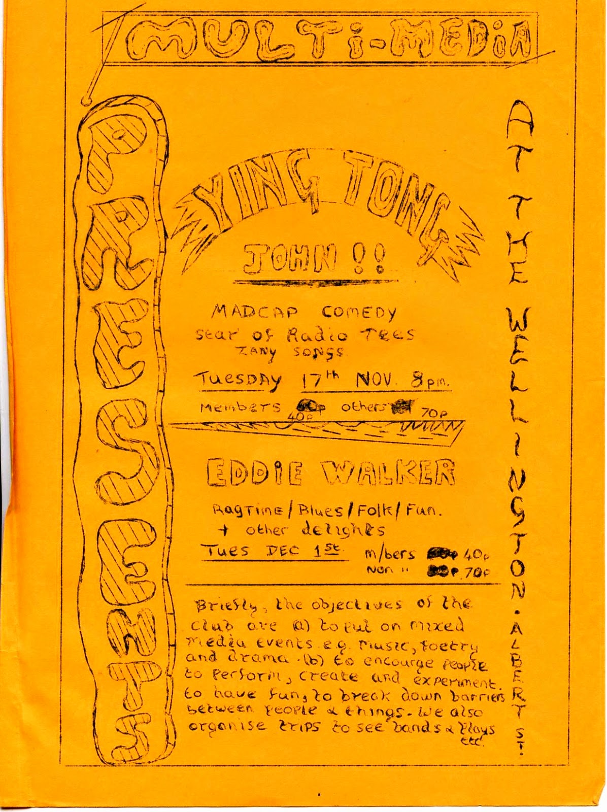 The gigs would have a mix student singer songwriters, poets, sketches and other features that came out of the workshops. Each session there would be a paid guest, which included, at the Lord Wellington, Bradford poet – Little Brother, Teesside singer songwriters Eddie Walker, Ying Tong John and others. There are some cassette tape recordings of a Multi-Media gig later when it was in the Student Union, which has a lot of hiss on it and noise from the bar but which i may be able to clean up and add here.Some of the gig posters are below.