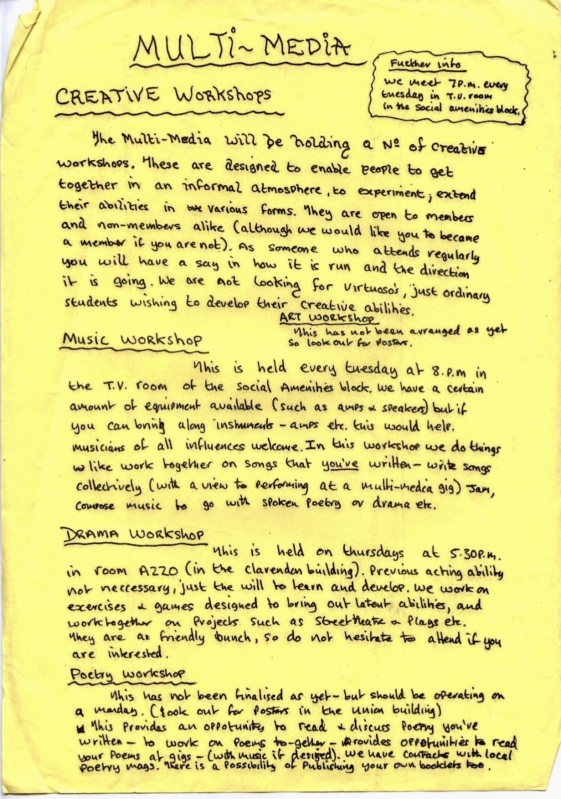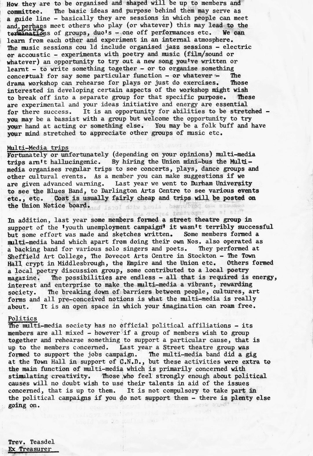 The Multi-Media Society comprised and number of linked ideas. First of all we established a number of weekly Creative Workshops around Poetry, Music and Drama and writing and a regular Mixed Media Gig Venue as an outlet for the work produced along with invited performance guests. Offshoots of these workshop, which often came together over a project and gave fresh impetus to the workshops. These might include Student Union Campaigns to we we supplied creative material and performances, musicals, like Godspell, which brought together actors and musicians. Another aspect of the Multi-Media Society was the availability of the Student Union minibus, which enabled us to organise trips to concerts, theatre and dance etc. Obviously, as students move towards their final year and exams and dissertations loom, new people take over the leading roles. To the best of my knowledge the Multi Media Society continued at least until 1985. Not sure after that as I had left in 1983. Fiona Richardson took over the Drama Group when Amelia left and Jeremy Hall took over as chair when Dave Wood stood down.