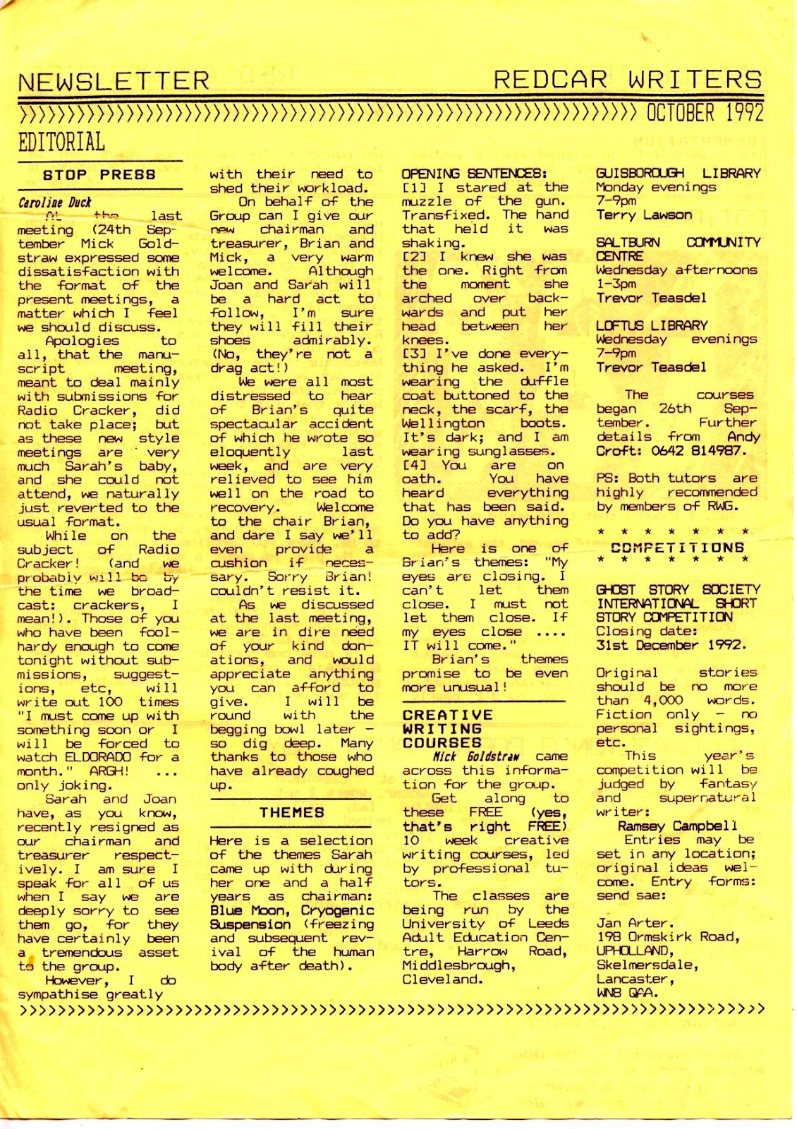 Joan booked a room at the library in Redcar and put out a press release to the local Free papers and Evening Gazette while Trevor mailed all those in the Redcar area on the Outlet and WEA Creative Writing mailing lists and put a notice in Outlet Magazine.As a surprise, 30 people turned up on the evening at Redcar Library and Trevor outlined possible structures and aims for the group to adopt. About 15 had come along thinking it was a Creative Writing Class,so Trevor directed them to his Saltburn Class and through the WEA set up an evening Creative Writing course at Ryedale School in Redcar and later another at the Library itself.
