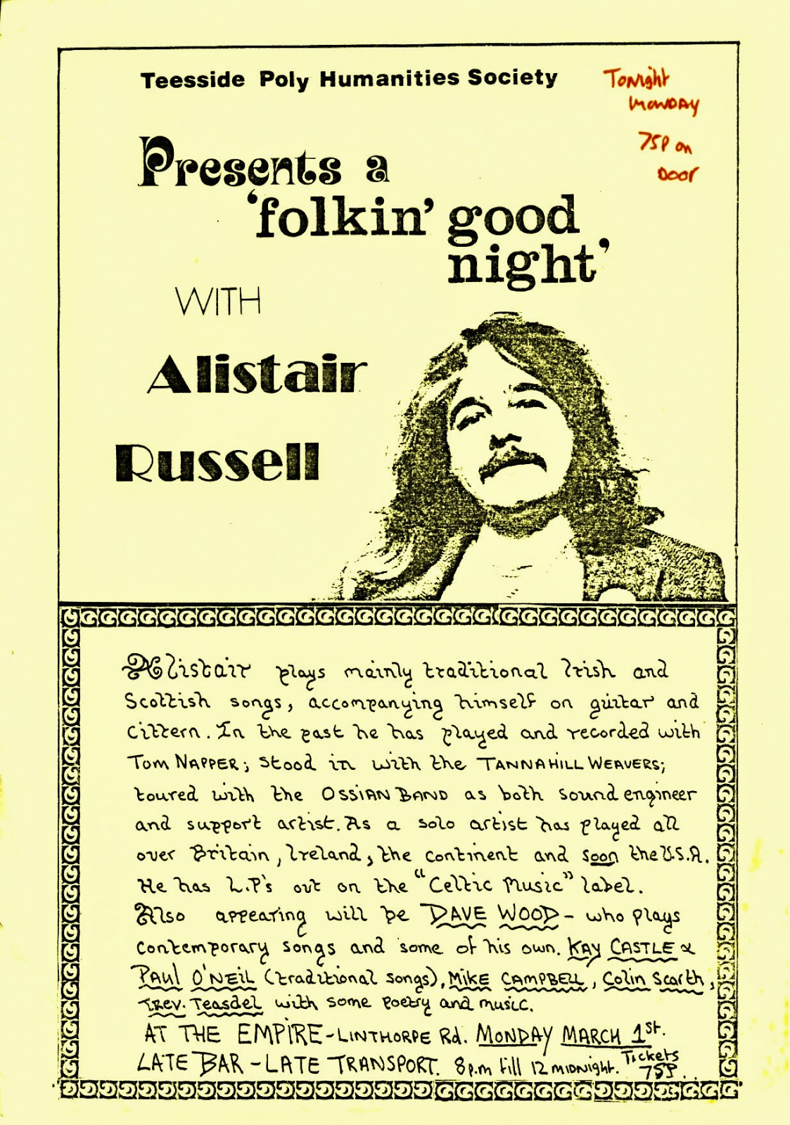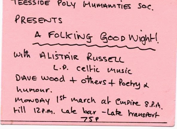 The idea came from Trev who had run similar events in Coventry in the mid 70’s at the Coventry Arts Umbrella and the Hobo Workshop in the years before the Two Tone put Coventry on the map. Trev wanted to do something similar on Teesside and his starting point was to get elected to the Teesside Poly Entertainment Committee, where he met the other co-founders and join The Humanities Society, through which he organised the first mixed media event posted below under Humanities. It was at the first Humanities gig, with Partners in Crime, that he first discussed the idea with singer songwriter Dave Wood, who liked the idea and they recruited Amelia Ward who was interested in forming a drama group at the Poly. A meeting was advertised and the Multi-Media Society was born as a Teesside Polytech Society and thus were able to apply for financial resources to run the Society.