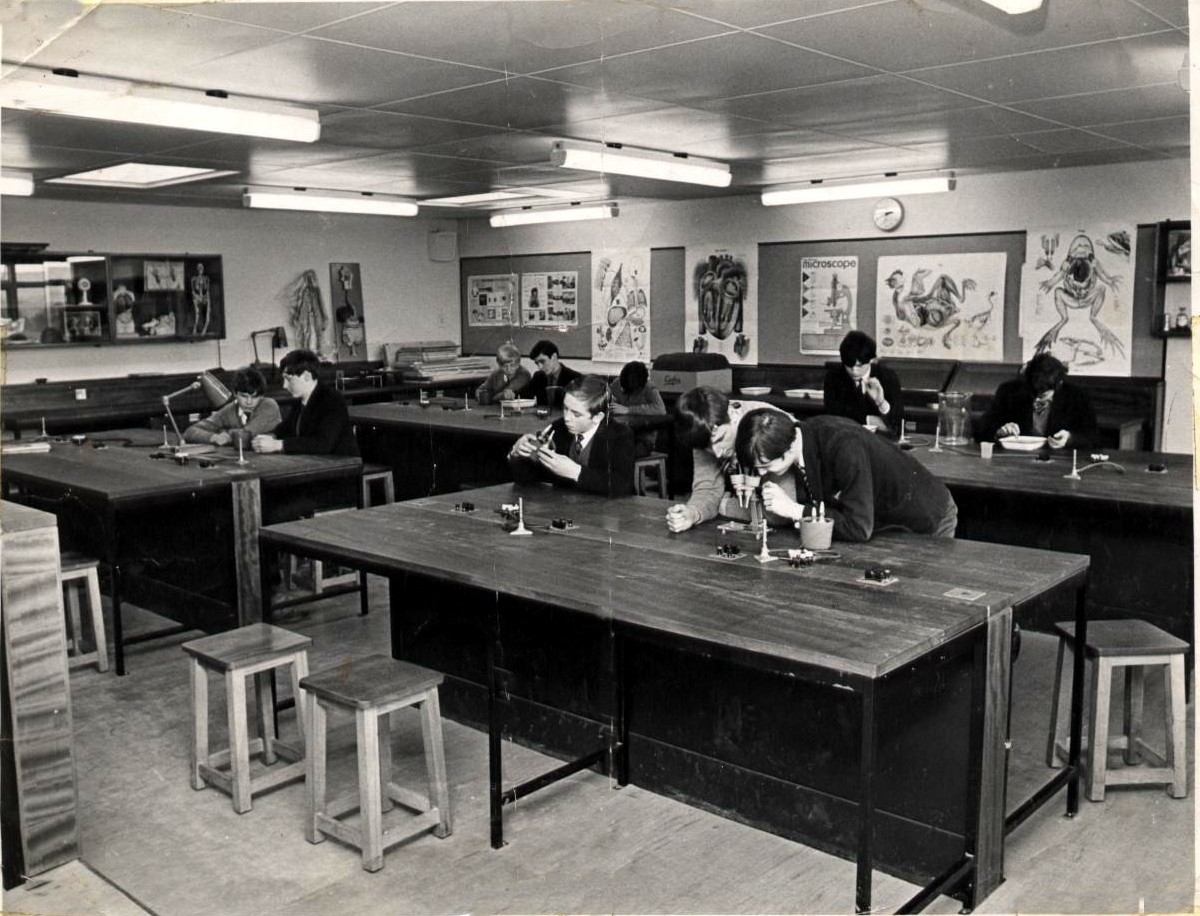 The original school laboratory was in the same cedar wood block as the woodwork dept. In the late sixties this was converted into a pupil coffee bar / recreation area after the New Block was built with a brand new biology and physics lab.