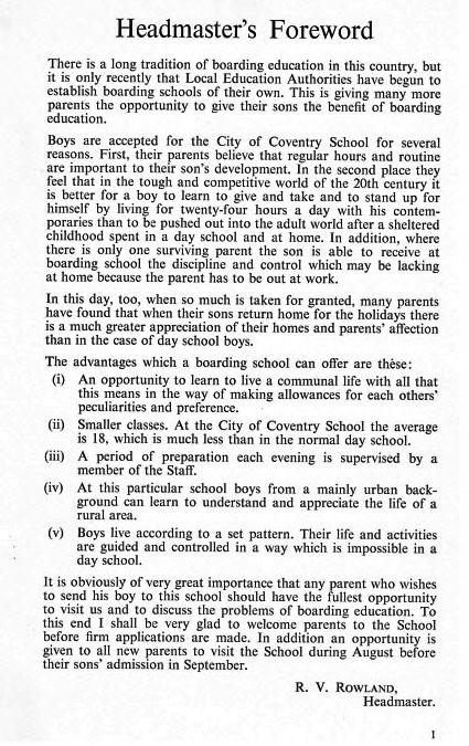 ” I find the whole social history aspect fascinating, particularly the development of a local authority version of a public school education. I think it was part of the whole post-war ‘leveling’ process, and something my father (Bob Rowland) was very interested in. He was from a very modest background, but had (I think) won a scholarship to Solihull School, and went on from there to build a successful academic career. He was passionate about learning (and couldn’t pass a bookshop, whether new or second-hand, without buying something), and wanted a good education to be available to all, although I’m not sure, from some of his personal writing, that he was convinced that boarding was really the best option.”
