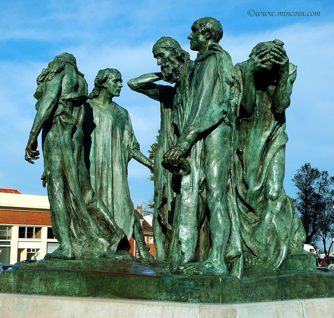 In this life-size statue of these men, Rodin dwells on their feelings or gestures, and on the way their shirts hang. Instead of putting them up on a pedestal, he represents them among us, humble and level with us. After the victory at Crécy (26th of August 1346), king Edward III of England established in front of Calais a bridgehead where he set up his Court, entertaining his people with festivities while patiently besieging Calais. He thus managed to starve the inhabitants into surrendering on the 4th of August 1347.