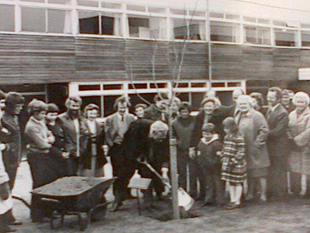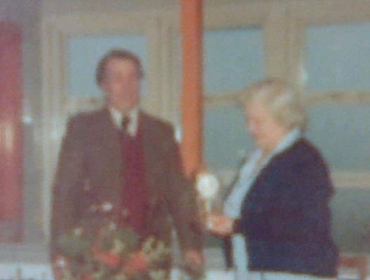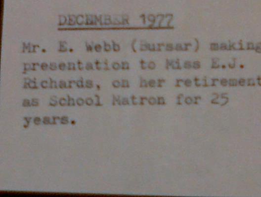 Eric Webb (Bursar) presenting an award to Miss E.J. Richardson (School nurse) in 1977 for 25 years service.