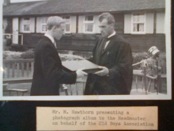 Martin Hawthorn (former head boy 1962-63) and later PE teacher 1970’s presenting a photographic album on behalf of the Old Boys Association to Headmaster George Parker sometime in the 60’s.