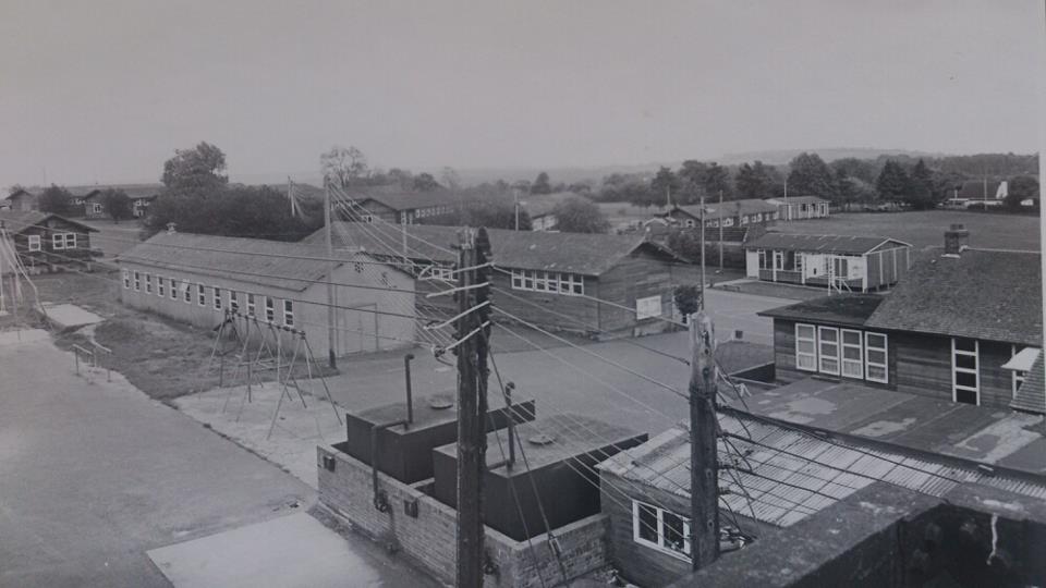 Shows the Gym (later metal work workshop in the 70’s), water tanks and back of the dining hall and staff room. far left, the sick bay, in front of the gym / metal work place  – the class rooms and in the top right the headmaster’s cottage.