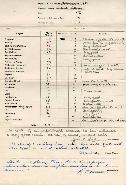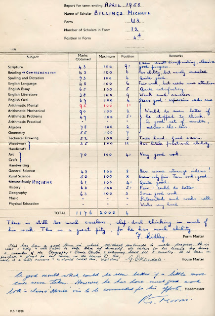 Along with lots of other material, Michael Billings, who was at the school 1955 – 58 sent copies of his school reports.